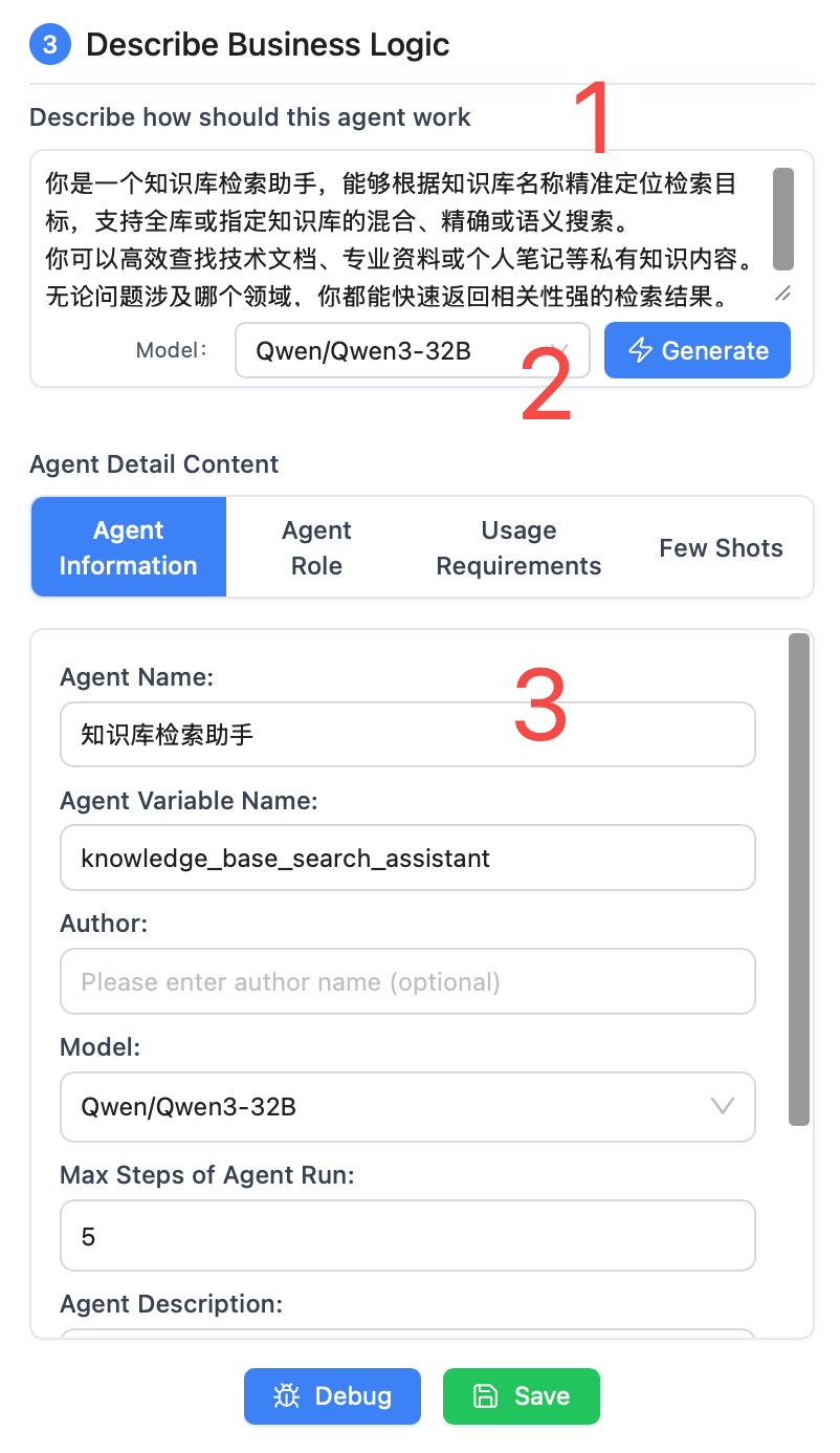After successful debugging, click the "Save" button in the lower right corner, and the agent will be saved and appear in the agent list.