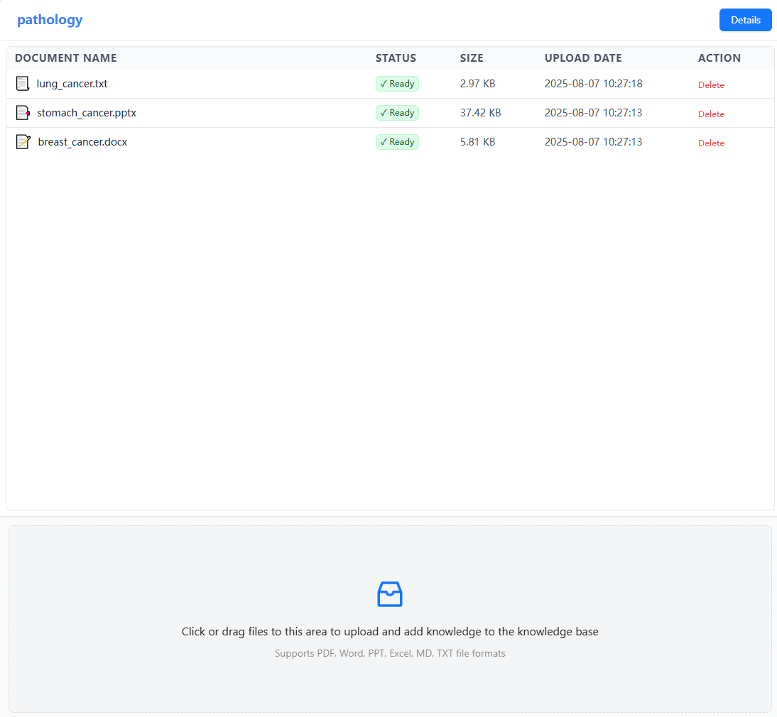 - Click the knowledge base name, then click "Delete" in the file list to remove files