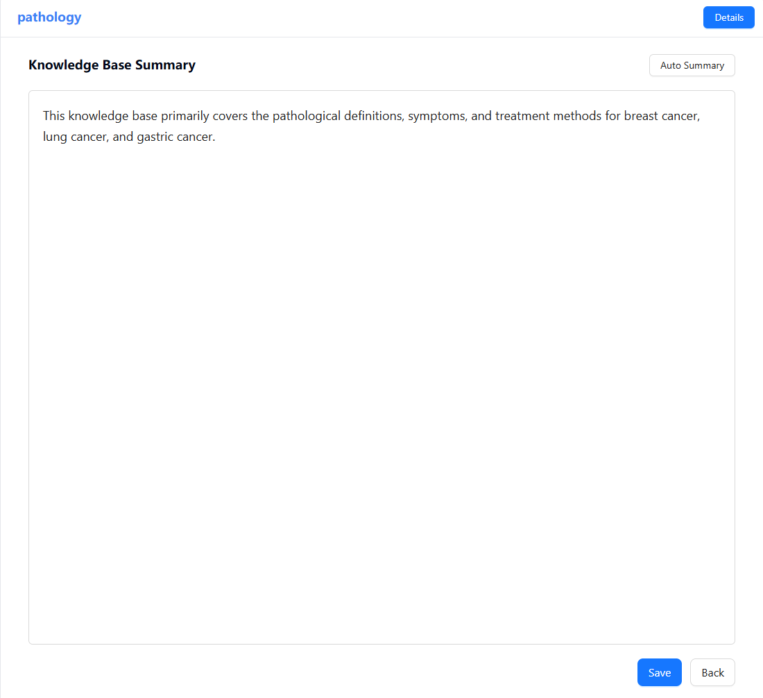 Note: The auto summary feature uses the system’s secondary model as configured in Model Configuration. If not configured, this feature will be unavailable. You can manually enter a summary for the knowledge base.