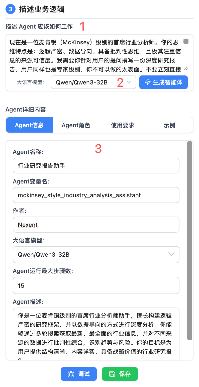 调试成功后,可点击右下角"保存"按钮,此智能体将会被保存并出现在智能体列表中。