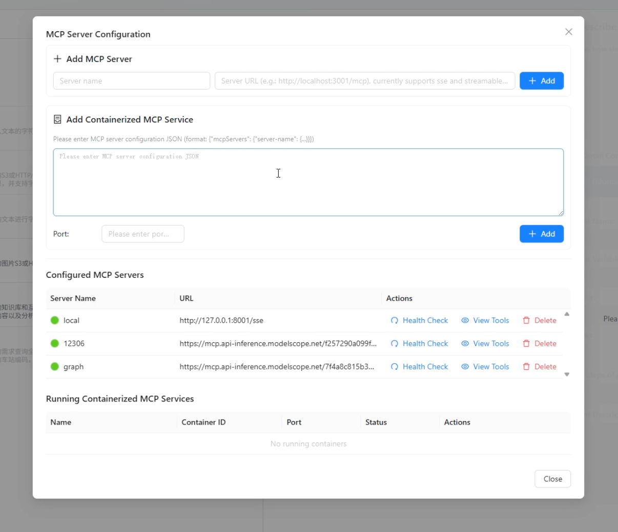 - 在 Add Containerized MCP Service 输入框中,填写符合示例格式的 JSON 配置