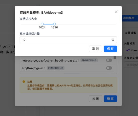- 如果批量修改模型,可以通过启动或关闭模型开关来添加或删除模型。您也可以通过点击右上角的"修改配置"按钮,对选中的模型进行批量配置修改。